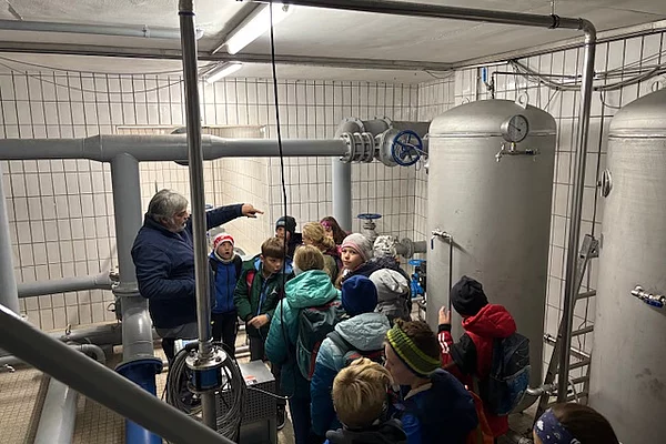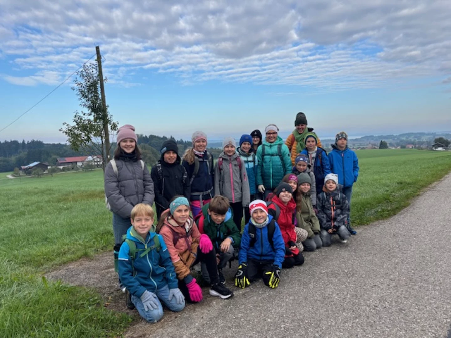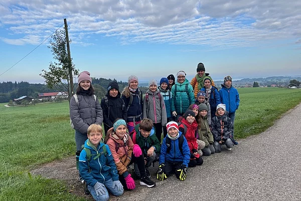 Unser Wandertag, der Klasse 4b, fand am Donnerstag, den 02.10.2025, statt. Er führte uns zunächst zum Hochbehälter für die Wasserversorgung der Gemeinde Grabenstätt. Dort erwartete uns der Wasserwart, Herr Steinbeck. Im Hochbehälter werden 500 Kubikmeter Wasser zur Wasserversorgung gespeichert. Das sind so viel wie 4160 volle Badewannen. Danach sind wir zum Bauernhof der Familie Wimmer-Wessely nach Oberaschau gewandert. Herr Wimmer zeigte uns den Stadl mit 115 Kühen. Besonders spannend war die Besichtigung der blubbernden Biogasanlage. Im Anschluss gab es noch für alle eine leckere Brotzeit und es war noch genügend Zeit für Spiel und Spaß auf der Wiese. Ein rundum gelungener Wandertag.