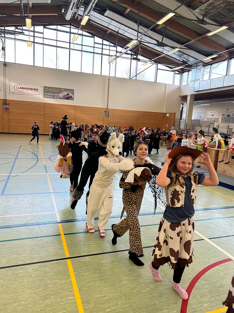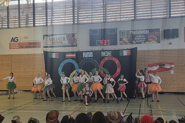 Vor den Ferien fuhren wir, die 3ten und 4ten Klassen der Grundschule Grabenstätt mit dem Bus nach Erlstätt zur SV Turnhalle. Als erstes wärmten wir uns mit Übungen zur Musik und mit Bällen auf. Die fünf Trainerinnen teilten uns in fünf Gruppen ein.