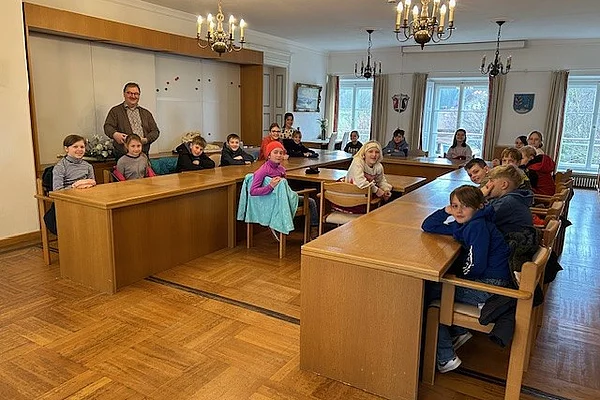 Ein besonderes Highlight war der Aufenthalt im Sitzungssaal: Hier hatten die Schülerinnen und Schüler die Gelegenheit, dem frisch wiedergewählten Bürgermeister ihre im Unterricht vorbereiteten Fragen zu stellen. Dieser beantwortete alle Anliegen geduldig, ehrlich und sehr anschaulich. Zudem durften die Kinder einen Blick auf unterschiedliche Wahlzettel der Kommunalwahl werfen.