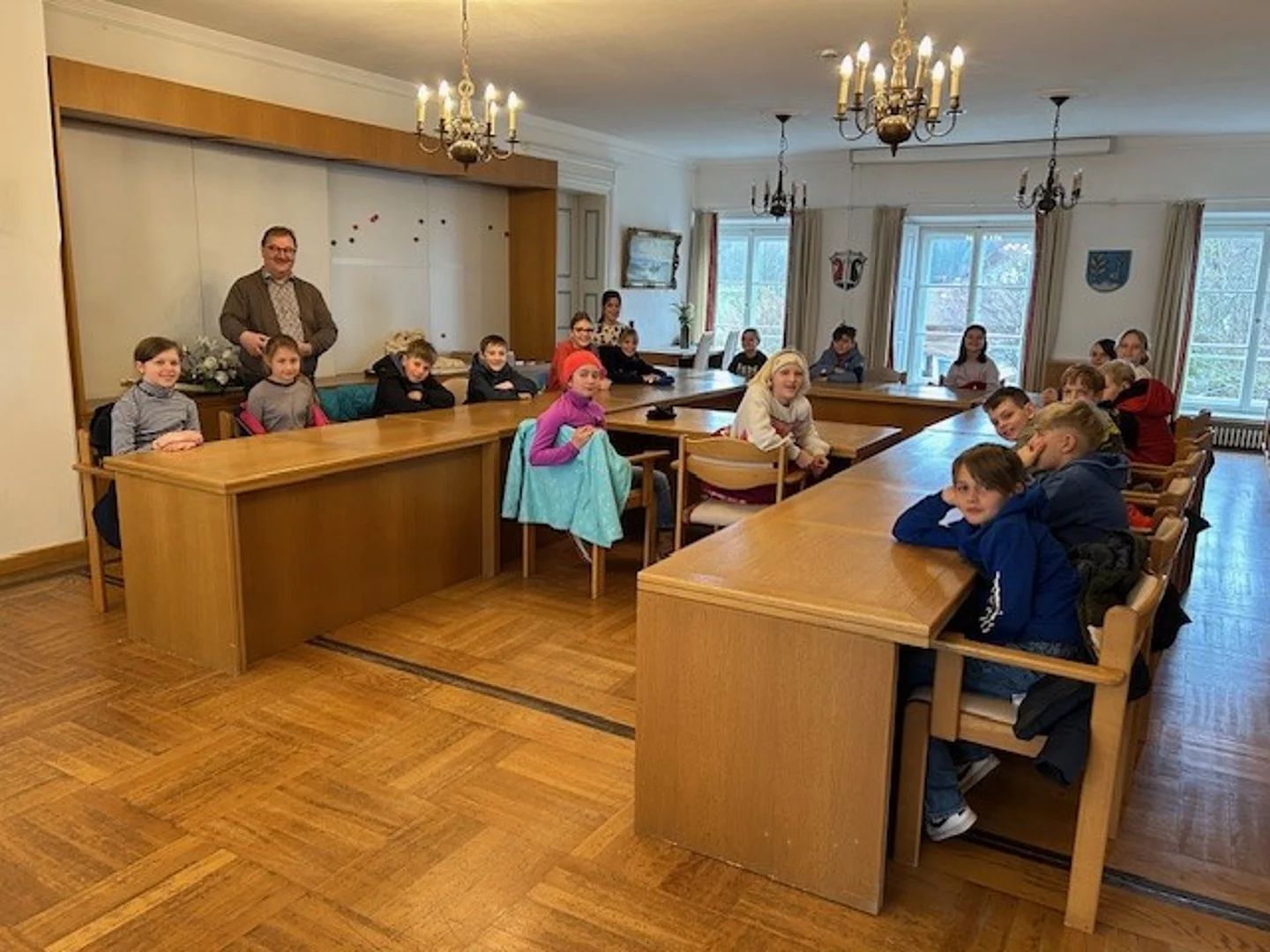 Im Rahmen des Themas „Gemeinde“ im Heimat- und Sachunterricht unternahm die Klasse 4b einen spannenden Ausflug ins Rathaus. Dort wurden die Schülerinnen und Schüler herzlich vom Bürgermeister empfangen.